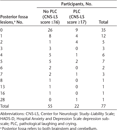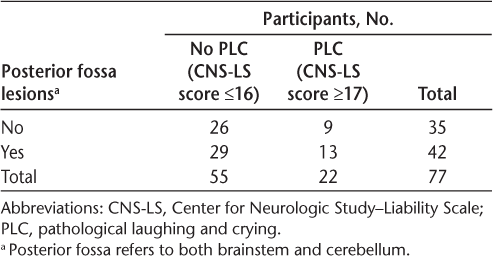 The relationship between posterior fossa lesions and PLC in people with MS was examined using a retrospective medical record review of people with MS (2012–2016) who had completed the Center for Neurologic Study–Liability Scale (CNS-LS) and had undergone 1.5-T magnetic resonance imaging within 6 months of each other.