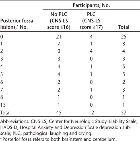 Medical record review identified 80 potential cases, with 77 included. Brainstem and cerebellar lesions were counted, measured, and compared between people with MS who had positive results on the CNS-LS (scores ≥17, n = 22) with those who had negative results on the CNS-LS (scores ≤16, n = 55). Initial χ2 analysis showed no significant difference in lesion numbers in people with MS without (CNS-LS score ≤16) versus with (CNS-LS score ≥17) PLC. When analyzing only people with MS without evidence of depression, a significant inverse relationship was identified such that fewer posterior fossa lesions on automated magnetic resonance imaging was associated with the presence of PLC.