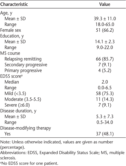 Of the medical records reviewed, 80 potential cases were identified of patients who had undergone MRI and completed a CNS-LS questionnaire within 6 months of each other. Three cases were excluded: two due to a diagnosis of clinically isolated syndrome and one due to lack of a HADS-D score. Demographic information is given in Table 1. The median HADS-D score was 4.0 (range, 0–17). There were 57 participants with a HADS-D score less than 8 (normal), 19 with a HADS-D score of 8 or greater (depressed), and 1 with an incomplete HADS-D questionnaire.