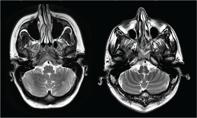 T2-weighted axial images demonstrate multiple hyperintense lesions in posterior fossa, seen in cerebellar hemispheres and in middle brainstem
