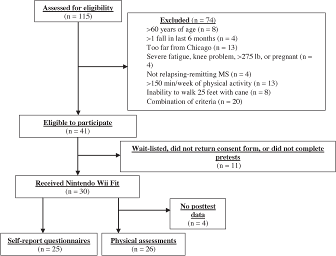 Participants were recruited through e-mails sent out by the National Multiple Sclerosis Society (NMSS), postings in neurologists' offices, and visiting MS support groups. Inclusion criteria were a physician-confirmed diagnosis of relapsing-remitting MS (RRMS) and approval to participate, location within 40 miles of the university, age of 18 to 60 years, and ability to ambulate 25 feet with or without a cane. Exclusion criteria were 150 minutes or more of PA per week, pregnancy, metabolic or cardiopulmonary disease, lower-extremity amputation, low vision (unable to see a television), severe fatigue (score of ≥6.5 on the Fatigue Severity Scale),25 major depression (two screening questions),26 epilepsy, two or more falls in the past 6 months, neuropsychological deficits (score of ≥27 on the MS Neuropsychological Screening),27 or any other condition or problem that compromised safety or ability to engage in the Wii Fit exercise program (Figure 1). Participants were also required to own a color television set, have enough space in their home to use Wii Fit, and not already have a Nintendo Wii in their home.