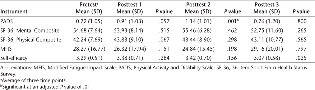 Findings of the stability analyses conducted between pretests for the questionnaires are listed in Table 3. None of the questionnaires changed significantly between pretests. Furthermore, scores demonstrated moderate-to-high correlations (0.48–0.90) between pretests. Thus, the three pretests were averaged together and used as a baseline reference to assess the effects of Wii Fit. The MANOVA for questionnaires (testing hypothesis 1) indicated significance across time (Wilks Λ = 0.693, F = 1.785, P = .039). Post hoc contrasts indicated that only PA (P = .001, ES = 0.65) significantly improved at posttest 2 (Table 4). At posttest 3, PA levels declined relative to posttest 2 levels and the differences were no longer significant compared with the baseline control period. Self-efficacy approached a near-significant decline at posttest 3 compared with the baseline control period (P = .025, ES = –0.47).