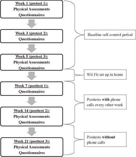 All questionnaires were administered by phone three times before participants gained access to Wii Fit (control period, at 2-week intervals), and three times after they received Wii Fit (posttest 1: immediately after; posttest 2: 7 weeks after; posttest 3: 14 weeks after). Physical assessments were conducted in participants' homes at the first pretest, immediately prior to obtaining access to Wii Fit, and 7 weeks after receiving Wii Fit. The timeline of the study is shown in Figure 2.