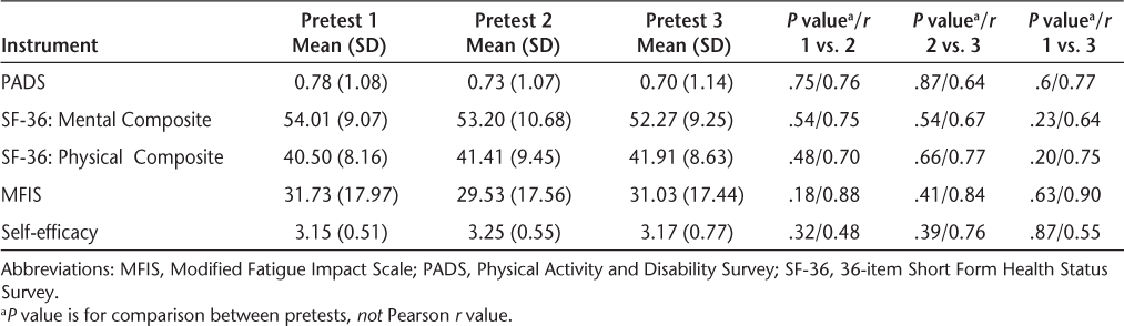 The stability of the questionnaires between the first and second pretests, the second and third pretests, and the first and third pretests was evaluated using paired t tests and Pearson r correlations. Stable scores were averaged together and used as a baseline reference.