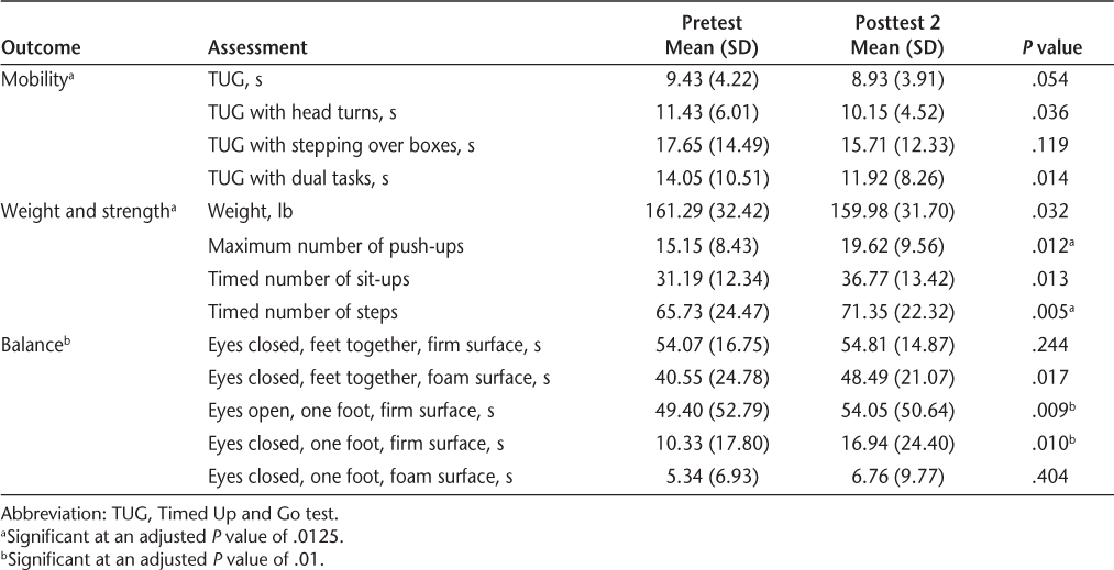 Four repeated-measures multivariate analyses of variance (MANOVAs) were conducted to test the hypotheses: 1) self-report questionnaires, 2) mobility, 3) weight and strength, and 4) balance. Post hoc contrasts determined which questionnaires or assessments changed significantly and when these changes occurred. A Bonferroni adjustment was made. Thus, the P value for post hoc contrasts was adjusted to .01 (.05/5) on self-report questionnaires, to .0125 (.05/4) on mobility, to .0125 (.05/4) on weight and strength, and to .01 (.05/5) on balance. Effect size (ES) or mean change (MC) was reported for significant and near-significant findings. All analyses were conducted using SPSS, version 17.0 (SPSS, Chicago, IL).