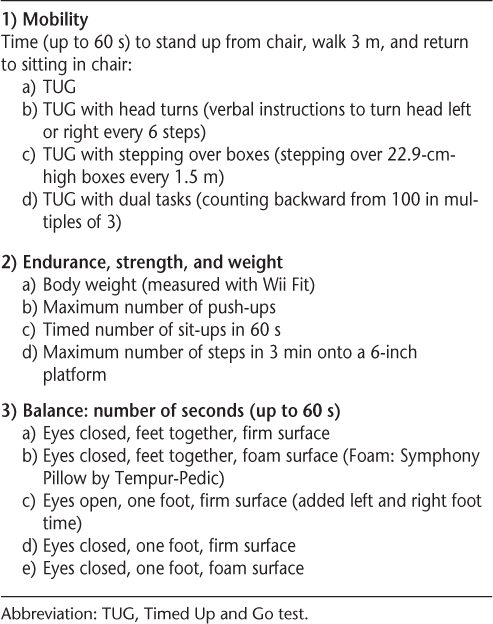 Fitness tests were administered to assess mobility, balance, strength, and weight. These tests were selected because they correspond with Wii Fit exercises. During the first home visit, we administered the Timed Up and Go (TUG) test,37 the Equiscale Balance test,38 and the 3-minute stepping test.39 However, because of concerns about ceiling effects, the second and third assessments were modified to incorporate more physically demanding tasks. Additional standardized assessments were selected from the Balance Evaluation Systems Test (BESTest)40 and YMCA Fitness Testing.41 The BEST-est assessments were modified to incorporate additional and more challenging balance tests as well as using only time to balance or time to walk 3 m (up to 1 min) in the analyses. We decided not to incorporate subjective clinical judgments (eg, stable or unstable in a balance task) into the scoring to help minimize bias. Given the encouragement that Wii Fit provides in losing weight, we also recorded body weight from the Wii Fit log. A summary of the physical assessments that we administered is provided in Table 1.