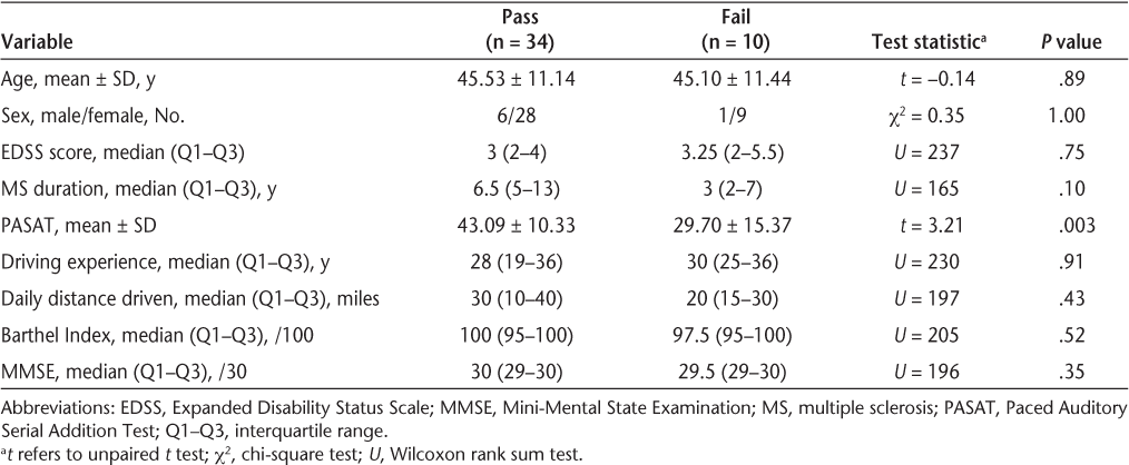 Forty-nine of 50 enrolled participants were evaluated in the GHSU driving laboratory, because one participant chose not to continue in the study after giving consent. Before the road test, one participant relapsed and four opted out of the study out of concern about potential legal implications of failing the road test despite being informed during the consent process that there were no such implications. As a result, data from 44 participants (mean ± SD age, 46 ± 11 years; 37 females and 7 males) with a diagnosis of relapsing-remitting MS (median duration, 6.5 years) were analyzed. As shown in Table 1, most of the clinical characteristics—including severity of disability (EDSS), driving experience, and physical functioning (Barthel Index)—were similar in those who passed the road test and those who failed the test. Only cognition, as measured using the PASAT, was significantly better in those who passed the road test.