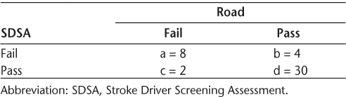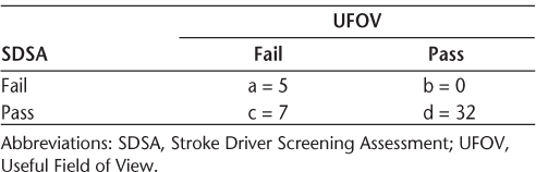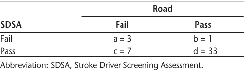 We also performed a discriminant analysis using our data to explore whether a more accurate prediction equation that will better predict participants' “pass” or “fail” performance on the road test can be obtained. For this purpose, a rank biserial correlation analysis between all SDSA variables and the “pass” or “fail” outcome on the road test was performed. Only variables that were significantly associated (P < .05) with the outcome and not intercorrelated were entered into a univariate regression analysis. Subsequently, only variables that had individual predictive values of the performance on the road test and with a P value not greater than .20 were entered into a discriminant analysis to derive the new equation. All statistical analyses were performed using SAS software, version 9.2 (SAS Institute, Inc, Cary, NC).