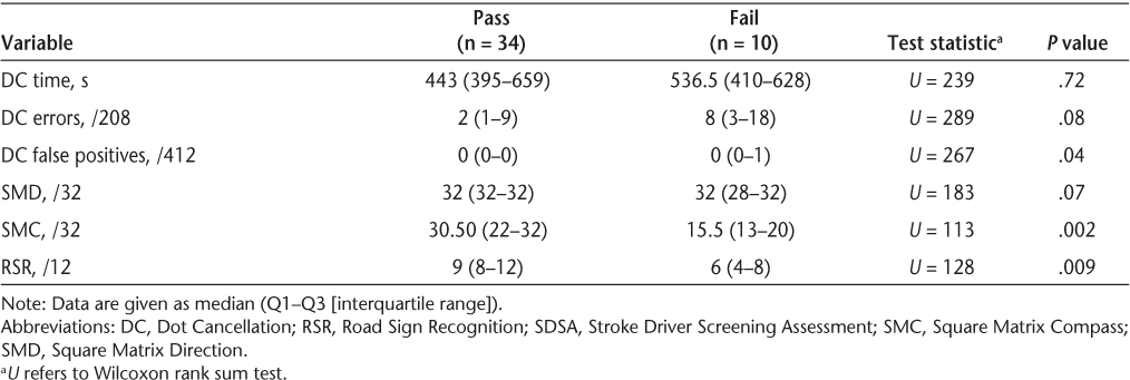 Comparison of SDSA performance of participants who passed versus those who failed the road test
