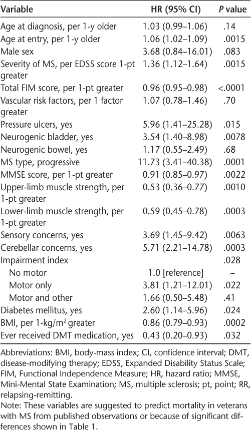 Cox proportional hazards regression analysis of variables suggested to predict mortality in veterans with MS