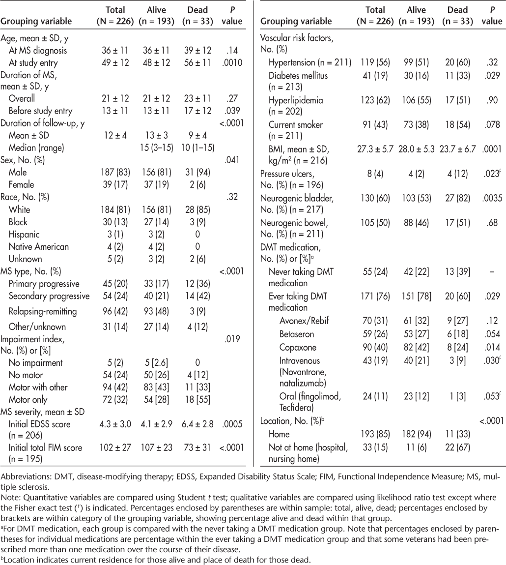 Baseline demographic characteristics of 226 veterans with MS, categorized as alive or dead at study's end