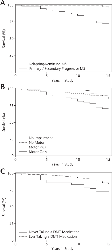 Kaplan-Meier survival curves for relapsing-remitting multiple sclerosis (MS) and primary and secondary progressive MS (A); with and without motor symptoms (B); and ever and never taking disease-modifying therapy (DMT) medication (C)