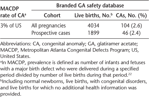 This study has some limitations. At the time that this report was completed, analysis of the duration and timing of exposure to branded GA was still ongoing. These results will be reported in a future article. Other limitations include the absence of specific information on the types and rates of the abnormalities associated with abortions, as well as data on mother's age, previous abnormal pregnancy outcomes, and exposure to other medications during pregnancy. Additional data on the prepregnancy course of disease for these patients, as well as the number of treated exacerbations and severity of disease, might also provide perspective on the pregnancy outcomes.
