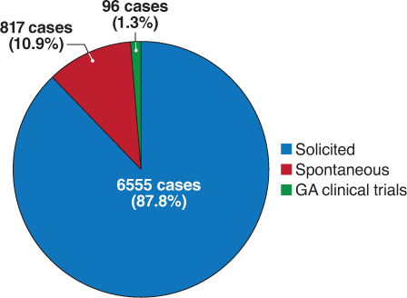 The Teva pharmacovigilance database search retrieved 7468 pregnancy cases categorized as spontaneous (case reports and series reported in the literature and unsolicited reports from patients), solicited (cases reported as a direct result of contact with the patient either as part of a patient support program or during market research), or clinical trial reports (cases reported during the branded GA clinical trials). Approximately 88% of the pregnancy cases in the database are solicited (Figure 1). In the database, mother and child reports are recorded as separate cases; however, they are linked because they describe the same pregnancy. The 7468 cases were reviewed to ensure that a pregnancy was not counted twice. As a result, 126 cases were eliminated, leaving 7342 pregnancies for analysis. Due to a twin pregnancy, the number of pregnancy outcomes was 7343. Of these, 2301 (31.3%) had an unknown outcome (eg, no report) or the pregnancy was still ongoing at the time of this report. We report herein only the analysis for the 5042 pregnancies with known outcomes.