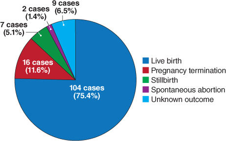 Of the 5042 pregnancies with known outcomes, 2235 were prospective cases and 2807 were retrospective. Of the prospectively reported pregnancies, 84.9% resulted in live births; 10.4%, in spontaneous abortion; and 3.2%, in elective termination. The remainder (<1.5%) were reported as stillbirth, intrauterine death/fetal demise, ectopic pregnancy, or hydatidiform mole. As expected, due to reporting bias, the total rate of abortions/pregnancy terminations and abnormal outcomes was higher for retrospective cases (Table 1).