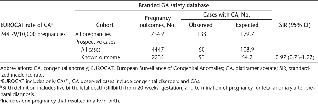 We analyzed data from Teva's global pharmacovigilance database. Pregnancy outcomes for patients treated with branded GA were compared with reference rates of abnormal pregnancy outcomes reported in two large registries representing the general population.