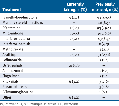 Medication infusion was the most common reason for hospitalization, reported in 16% of cases, followed by exacerbation of MS in 13.8% cases, and infection in 4.3% cases. Ocrelizumab (5.3%), steroids (3.8%), and rituximab (3.2%) were the most common treatments prescribed. Patients had been treated previously with oral and intravenous steroids, azathioprine, and mitoxantrone, as shown in TABLE 1.