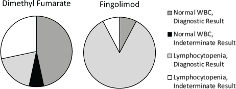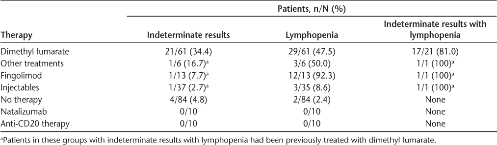 Table 3 gives a breakdown of the indeterminate results by immunomodulatory therapy. There were four patients who had indeterminate testing while off therapy. Three of these four patients with indeterminate results had repeated testing with negative results; we were unable to repeat testing for the fourth patient. Although 12 of 13 patients (92.3%) taking fingolimod in the study had lymphopenia, only one of these patients (7.7%) had an indeterminate result (Figure 1).