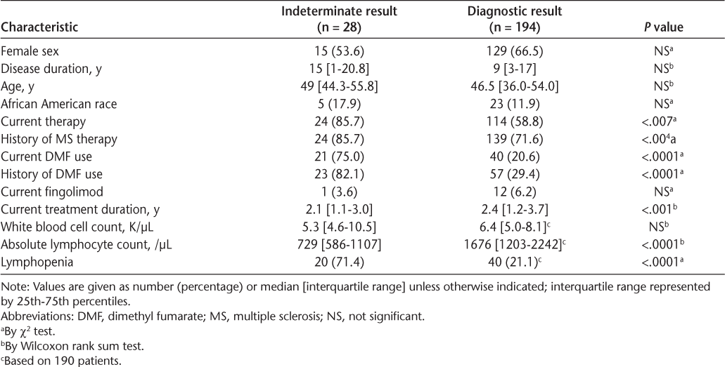Twenty-eight of 222 patients (12.6%) had an indeterminate assay result. Twenty-one of these patients were taking DMF, four were untreated, and one each were taking fingolimod, methotrexate, and interferon. Characteristics of those with and without indeterminate results are presented in Table 1. Fifteen of the 28 patients (53.6%) with indeterminate results were women. The median age of participants with indeterminate results was 49.0 (range, 44.3–55.8) years. Patients with indeterminant results were more likely to be receiving immunomodulatory therapy (83.3%; odds ratio [OR] = 3.6, P = .008) or have a history of immunomodulatory therapy (90.0%; OR = 3.7, P = .027). This effect was largely due to DMF use because patients with indeterminate results were more likely to be currently taking DMF (OR = 9.3, P < .001) or to have previously taken DMF (OR = 9.9, P < .001). In contrast, only one of the 28 indeterminate results (3.6%) occurred in a patient taking fingolimod, and there was no association between fingolimod use and indeterminate results.