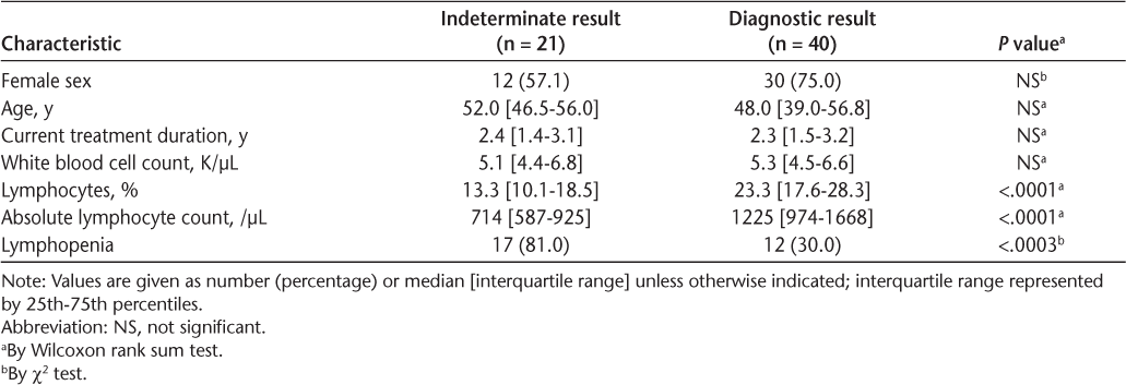 Patients with indeterminate results had decreased absolute lymphocyte, CD3, CD4, and CD8 counts (P < .001), as well as a higher CD4/CD8 ratio (P = .002). Patients with indeterminate results were also much more likely to have lymphopenia, with 20 of 28 (71.4%) having lymphopenia (OR = 13.1, P < .001).