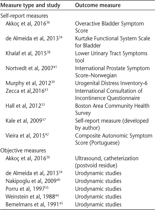 In addition to issues of bias, there is a lack of consistency in self-report outcome measures used, with each study using a different measure. Interestingly, none of the studies that investigated frequency symptoms were consistent with the ICS recommendation of using a bladder diary. These factors led to considerable variability in study results, including wide CIs and considerable heterogeneity. The European Association of Urology guidelines recommend using validated questionnaires in future studies,8 which, in turn, will enable data synthesis and allow more detailed comparison of results from different studies.