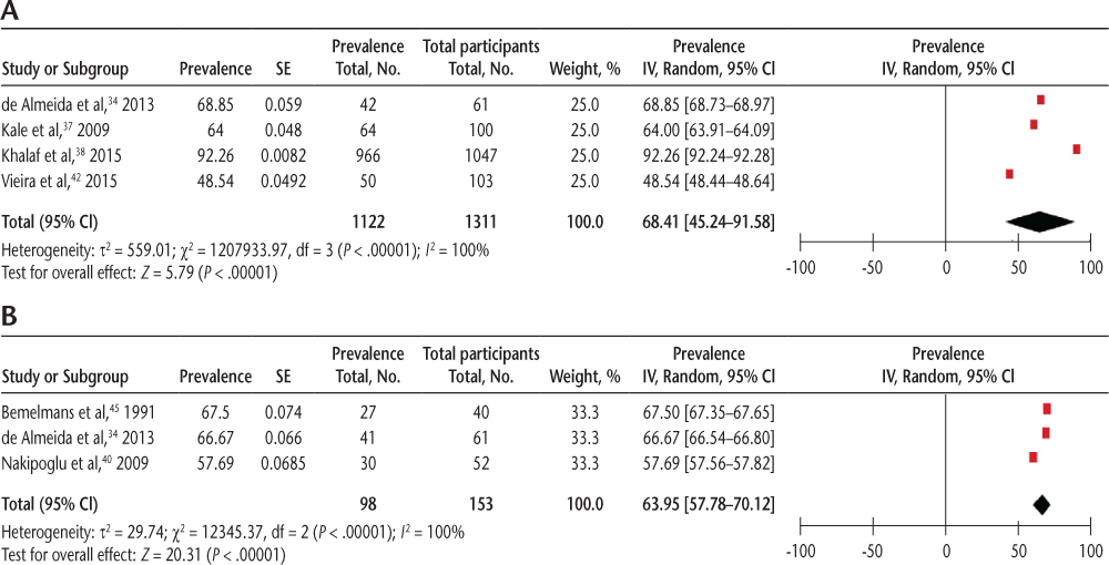 The pooled prevalence of general LUTSs using self-report measures from four studies34 37 38 42 was 68.41% (95% CI, 45.24%-91.58%) (Figure 1A) and detected by UDSs from three studies34 40 45 was 63.95% (95% CI, 57.78%-70.12%), with significant heterogeneity (I2 = 100%) (Figure 1B).