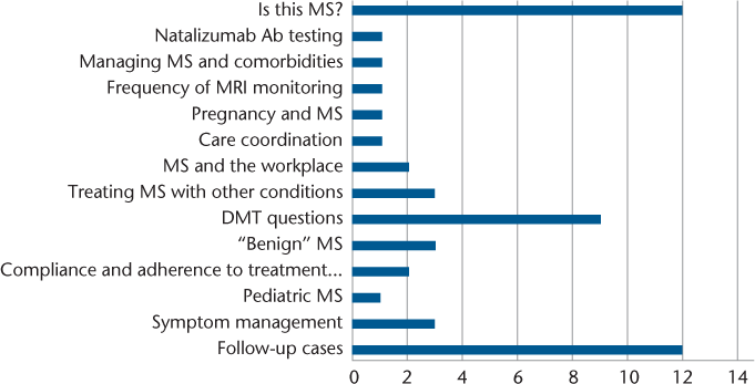 All the participants expressed good value in the sessions having both a didactic presentation and case consultation. Some participants (two generalists and one neurologist with 100–200 patients with MS) would have preferred more focus on the didactic portion of the sessions. Most participants expressed the value of the case consultations in helping to recognize the complexity of MS cases and how there is usually not one right answer to a question. Participants appreciated the variety of opinions from the “experts,” which added to their own confidence in delivering optimal MS care.