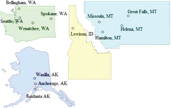 Map showing distribution of practice sites across Washington, Alaska, Idaho, and Montana