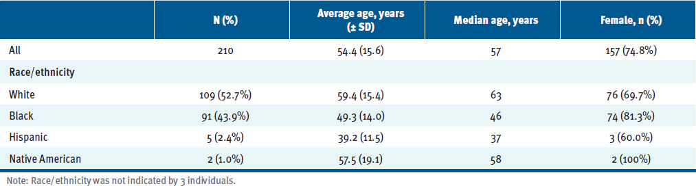 A total of 210 individuals fulfilled the inclusion criteria. As expected from previous studies, there was a 3:1 female-to-male ratio.1 The average age of our study population was similar to the national average, 54.4 years vs 51.7 years, respectively (TABLE S1).6 The average years since diagnosis was 16. Of the cohort, 111 (52.4%) had RRMS, 50 (28.3%) had SPMS, 30 (14.2%) had PPMS, and 9 (4.2%) did not have a phenotype identified. Assistive devices for ambulation (ie, cane, walker, or wheel-chair) were used by 131 (62.4%).