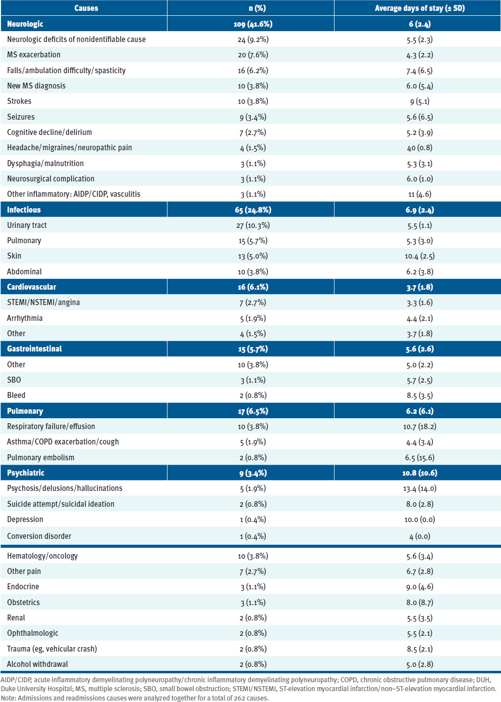 Demographic data (eg, age, sex, and race); length of stay; type of MS; extent of disability; admission diagnosis; DMT at time of admission; admitting service; and evaluations by physical therapy, occupational therapy, and speech therapy during admission were obtained, as were 30-day readmission rates and the associated diagnosis. Admission diagnoses were categorized by system (neurologic, cardiovascular, pulmonary, infectious, etc) and subcategorized by particular problems within those systems. A category for neurologic deficits without an identifiable cause was made to capture patients who presented with a neurologic complaint, but for whom further workup did not identify pathology or cause. Pseudorelapses were not included in this category.