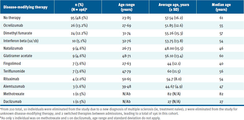Approximately half of the admitted patients were not on any DMT (48.2%) (TABLE 2). The median age among the group not taking any DMT was comparable to the median age of the treated group. The median age was lower for the group taking fingolimod and natalizumab (40 years and 46 years, respectively), compared with the other treatment groups (Table 2). The most common DMTs for admitted patients were ocrelizumab and dimethyl fumarate (13.1% and 12.1%, respectively). No major trends were identified when causes of admission were compared with DMT used. Also, no differences were observed in admission due to infectious causes in patients on high-efficacy therapy vs low- to moderate-efficacy therapy. The most common causes of admission for untreated patients were MS exacerbation (15.7%), UTI (11.0%), and pulmonary infection (7.9%). The most common causes for admission in patients who were on a DMT were neurologic deficits of unclear etiology (13%), UTI (13%), and skin infection (5.8%).