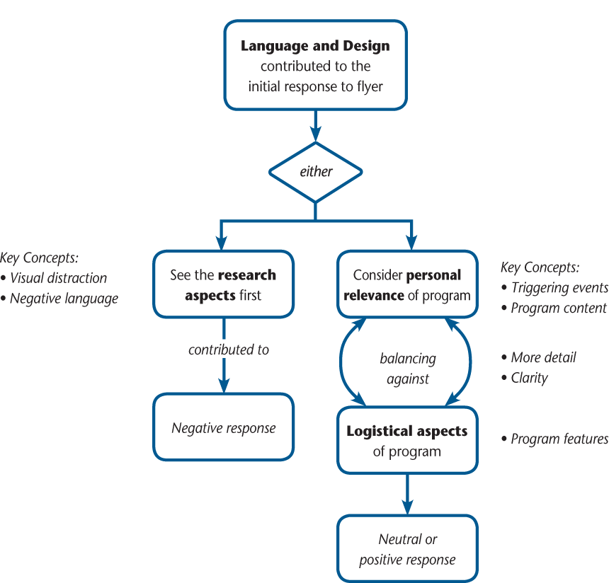 We organized the data into seven key concepts that were reflected in the participants' responses to the three advertisements: visual distraction, negative language, triggering events, program content, amount of detail, clarity, and program features. These concepts were then further organized in relation to each other through one major overarching theme (language and design) and three subthemes (research aspects, personal relevance, and logistical aspects). Figure 1 illustrates the relations among these themes and the key concepts.