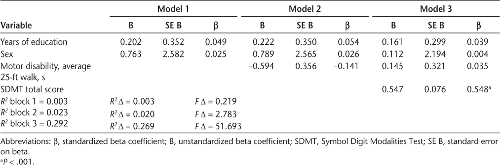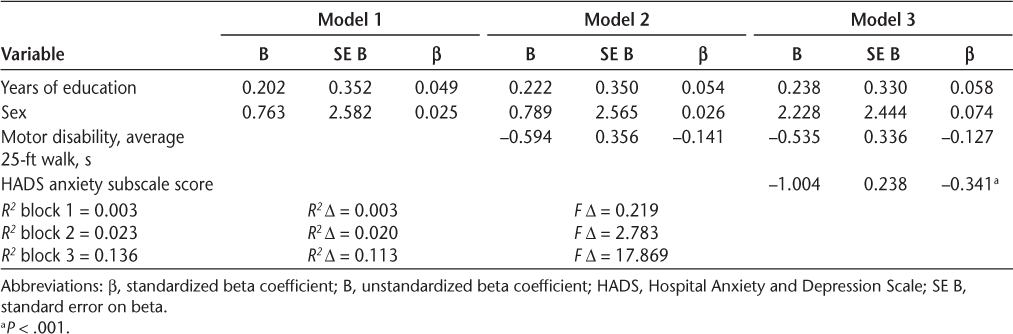 Preliminary analyses were conducted to ensure that there were no violations of the assumptions of normality, linearity, multicollinearity, and homoscedasticity. The first regression determined the effect of processing speed on verbal learning. Years of education and sex were entered in the first step. Walking speed, as a measure of disability, was entered in step 2. The SDMT total score was entered in step 3 as a measure of processing speed. The CVLT-II total score (trials 1-5) was the measure of verbal learning and served as the primary outcome. Processing speed was a uniquely significant predictor of verbal learning (β = 0.55, ΔR 2 = 0.27, P < .001) (Table 2). A second regression retained the first two steps from the previous analysis but inserted the anxiety subscale of the HADS in the third step in place of the SDMT. Anxiety was a uniquely significant predictor of verbal learning (β = −0.34, ΔR 2 = 0.11, P < .001) (Table 3).