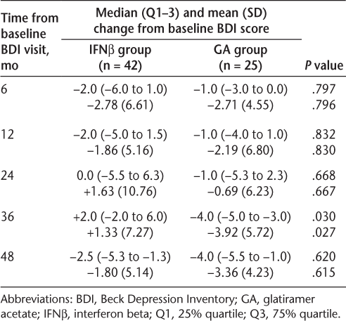 Furthermore, no statistically significant differences in mean change in BDI score from baseline were observed between groups for any other time interval, with the sole exception of the 36-month interval, at which point the mean changes in BDI score in the IFNβ and GA groups were +1.33 ± 7.27 and −3.92 ± 5.72, respectively (P = .027) (Table 2). This difference was no longer present at the 48-month assessment.