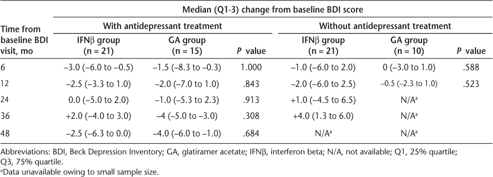 Lastly, no significant differences in median change in BDI score from baseline were observed at any time points between patients receiving antidepressants in the IFNβ subgroup and those receiving antidepressants in the GA subgroup (Table 3). Similar results were observed when comparing patients who were antidepressant-free in the IFNβ subgroup with those who were antidepressant-free in the GA subgroup. Fifty percent of patients in the IFNβ subgroup received antidepressants during the study period, compared with 60% of those in the GA subgroup.