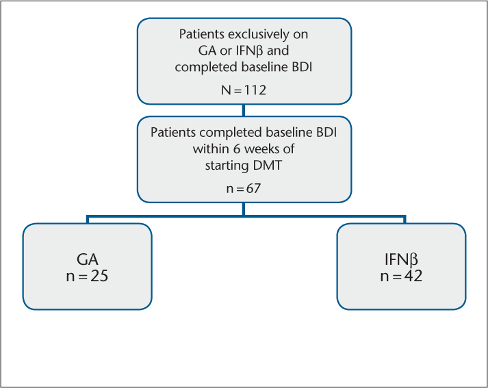 The medical records of patients with RRMS who were examined at the MS Center from 2000 to 2007 and whose records were maintained at University Neurologists, PSC, were included in the analysis. In 2000, routine screening for depression was initiated at the MS Center, and all MS patients were assessed using the Beck Depression Inventory (BDI) at all follow-up visits. Of the patients treated with a single therapy (either an IFNβ or GA) for up to 4 years, only those patients who were administered the BDI within 6 weeks of starting their DMT were included in this study (n = 67). The University of Louisville Investigational Review Board reviewed the study and approved its conduct using de-identified data from the records review.