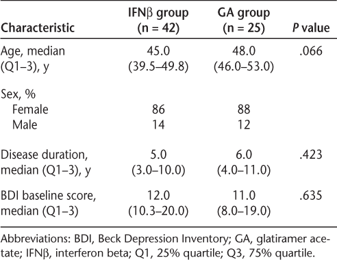 A total of 112 patients were diagnosed with RRMS and remained exclusively on either IFNβ (n = 80) or GA (n = 32) during the study period. All patients completed an initial BDI and were assessed using the BDI at all follow-up visits. Of the 112 patients, a total of 67 patients had completed a BDI within 6 weeks of initiating the DMT (IFNβ: n = 42; GA: n = 25) (Figure 1); only these patients were included in the analysis. Baseline characteristics were similar between the two treatment groups with respect to gender, age, and total BDI score (Table 1). The IFNβ group was 86% female, with a median age of 45 years (range, 39.5–49.8 years) and a median disease duration of 5 years (range, 3–10 years). Patients in the IFNβ group were moderately depressed at the start of the study, with a median total BDI score of 12 (range, 10.3–20.0). The GA group was 88% female, with a median age of 48 years (range, 46–53 years) and a median disease duration of 6 years (range, 4–11 years). The patients in this group were also moderately depressed, with a median total BDI score of 11 (range, 8–19).