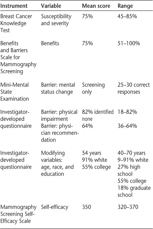 The probability that women will engage in early-detection health behaviors can be predicted from individual variables, such as barriers/benefits and demographic/sociopsychological factors including age and education.5 Susceptibility has been measured specifically in mammography behavior by risk in women with intentions to have a mammogram.6–9 In contrast, there is little documentation of severity alone in relation to predictors of mammography behavior except by Champion.10 11 Benefits and barriers have been clearly documented to be predictive of mammography screening adherence.12–14 Cues to action used in mammography adherence have been expressed specifically by physician recommendation.9 15