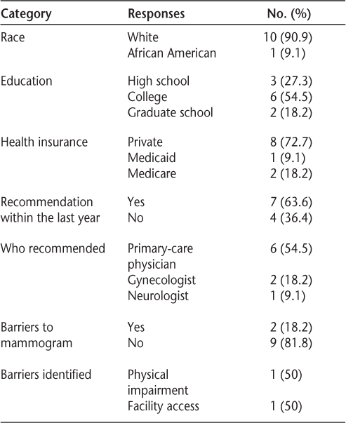 A total of 11 women met the inclusion criteria of the study and were interviewed by phone. All of the women completed the phone interview, with some using a speaker phone because they were unable to hold the receiver. The duration of the interview was 45 to 60 minutes. The target time used for obtaining a mammogram was within 2 months of receiving the NMSS intervention.