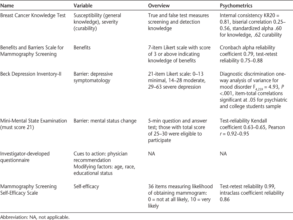 The following measures were used in this study: the Breast Cancer Knowledge Test (BCKT),28 the Benefits and Barriers Scale for Mammography Screening,29 the Beck Depression Inventory, second edition (BDI-II),30 the MMSE,31 an investigator-developed questionnaire, and the Mammography Screening Self-Efficacy Scale (MSSS)17 (Table 1).