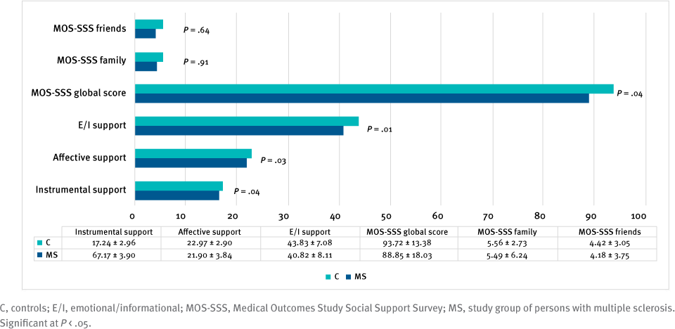 Patients with multiple sclerosis obtained significantly lower perception of social support scores than controls.