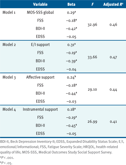 Multiple regression analyses showed that the 4 tested models contributed to HRQOL-explained variance (41%–47%); the emotional/informational social support model explained the most variance (47%). Fatigue and depression resulted in significant predictors in all models, as well as all social support scores. Global disability, as measured by the EDSS, was not a significant predictor of HRQOL (TABLE).