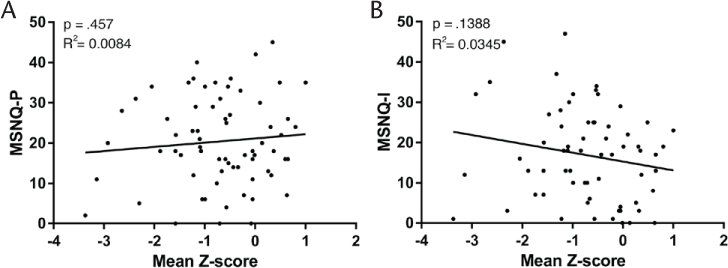 When correlating the MSNQ-I or the MSNQ-P (greater than the cutoff score of 26 points) with the z score of the complete neuropsychological test battery, we found no significant squared correlation with either scale (MSNQ-P: R 2 = 0.0084, P = .457; MSNQ-I: R 2 = 0.0345, P = .1388) (Figure 3). Neither did the MSNQ-I and the MSNQ-P correlate with the individual neuropsychological tests (Table 2). We found low sensitivity and specificity of the MSNQ-P (21.4% and 76%, respectively) and the MSNQ-I (33% and 65.5%, respectively). Both scales did, however, correlate to BDI scores (MSNQ-P: R 2 = 0.25, P < .0001; MSNQ-I: R 2 = 0.197, P < .0001 [data not shown]).