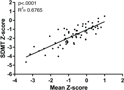 As a positive control for bedside neuropsychological testing in patients with MS, we also tested the squared correlation between the well-established SDMT and the total neuropsychological test panel. As expected, this squared correlation was highly significant (R 2 = 0.68, P < .0001) (Figure 4). When correlated to the individual neuropsychological tests, we found the best squared correlations to Digit-Symbol Coding and the Trail Making Test B. The SDMT also correlated to the Rey Auditory Verbal Learning Test and the Wisconsin Card Sorting Test but not to the Boston Naming Test (Table 2).