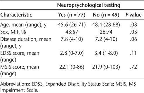 Comparing patients who underwent neuropsychological testing (n = 77) with those who did not (n = 49), we found no differences in demographics in relation to age, disease duration, and disability as measured by the EDSS and the MSIS. There were also more men in the neuropsychological group (43%) compared with in the group that was not tested by a neuropsychologist (26%) (P < .05) (Table 1).