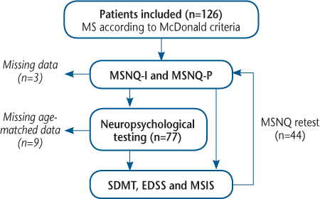 The Multiple Sclerosis Neuropsychological Screening Questionnaire (MSNQ) is a brief patient-reported outcome scale by either the patient (MSNQ-P) or the informant (MSNQ-I) and is easy to administer. It has previously been shown to have acceptable reproducibility and to provide valid assessment of cognitive dysfunction in American, Argentinean, and Dutch populations. In contrast to the SDMT, the MSNQ can provide information about self- and informant-perceived cognitive dysfunction.10–13