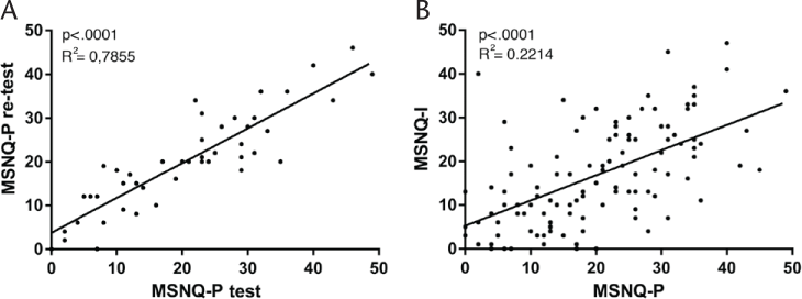 The squared test-retest correlation of the MSNQ-P was R 2 = 0.79 (P < .0001) (Figure 2A) and the squared correlation of the informants (MSNQ-I) and patients (MSNQ-P) was low but significant (R 2 = 0.22, P < .0001) (Figure 2B).