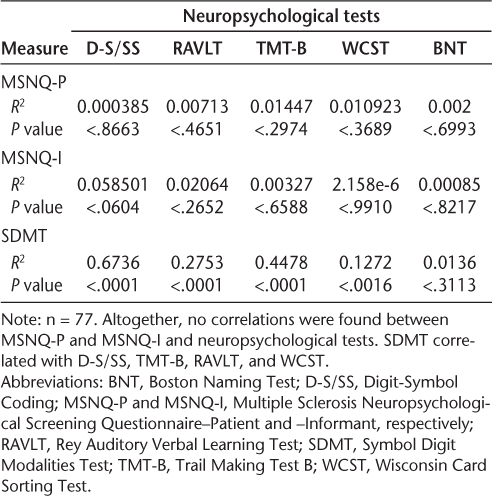 Of 126 patients with MS and their informants tested with the MSNQ, 77 also underwent formal neuropsychological testing. All patients were tested with the SDMT and assessed clinically using the Expanded Disability Status Scale and MS Impairment Scale.