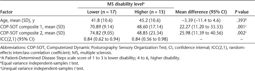 All six conditions of the CDP-SOT had good-to-excellent reliability (interclass correlation coefficients, 0.70–0.90) and excellent reliability for composite scores (0.90). Composite scores were significantly greater in the lower-disability group versus the higher-disability group at session 1 (70.89 vs. 48.60, P = .001) and session 2 (74.82 vs. 48.85, P = .002).