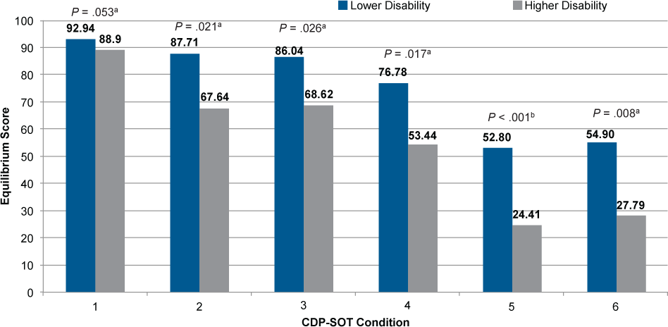 Comparison of equilibrium scores for each of the six conditions of the computerized dynamic posturography sensory organization test (CDP-SOT) in the lower-disability (Patient-Determined Disease Steps [PDDS] scale score of 1–3) and higher-disability (PDDS scale score of 4–6) groups